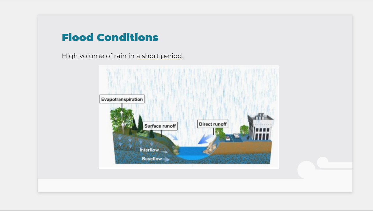 One interesting tidbit was that when rain lands on earthy substances, like grass or forest, it takes about 400 days for the water to reach the stream. But when rain lands on concrete, like driveways, the water immediately runs off towards the stream. This means that paved surfaces increase the likelihood of floods.